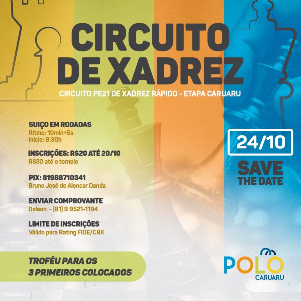 Caruaru sediará, neste domingo (24), a 4ª etapa do Circuito PE21 de Xadrez Rápido. Promovida pela Federação Pernambucana de Xadrez, a competição acontecerá no Polo Caruaru, a partir das 9h30, e reunirá 80 participantes, entre amadores e profissionais. De acordo com o regulamento do torneio, o objetivo da iniciativa é apontar os campeões pernambucanos absolutos 2021 na modalidade rápido e movimentar ratings FIDE e CBX.