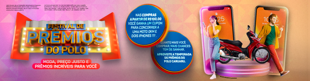 Até o dia 7 de fevereiro de 2022, o Polo Caruaru estará realizando um Festival de Prêmios com sorteio de uma moto 0Km e dois iPhones 11. A promoção será válida para todos os clientes que fizerem a partir de R$ 100 em compras nas lojas participantes, que estão sinalizadas por meio de adesivos.