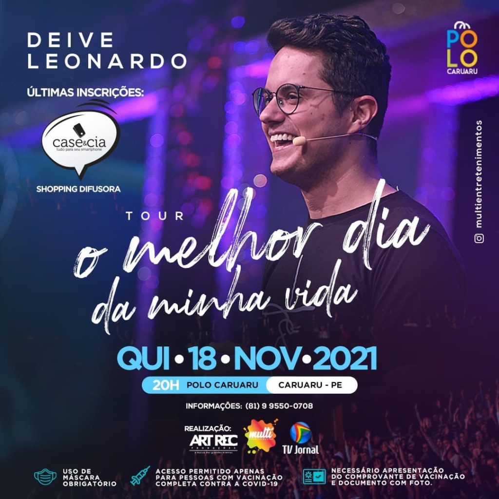 O evangelista Deive Leonardo realizará, nesta quinta-feira (18), sua primeira palestra em Caruaru. O evento acontecerá no Polo Comercial, a partir das 20h, e faz parte da turnê ‘O melhor dia da minha vida’, na qual ele divide seu caminho de pregação, compartilhando reflexões sobre perseverança e alegria.