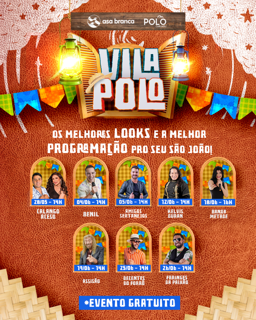 Com o objetivo de trazer o São João tradicional de volta, o Polo Caruaru vai realizar o Vila Polo, com uma programação de São João gratuita super especial que promete agitar o Centro de Compras e Lazer. A programação, que terá início no sábado (28/05), vai contar com diversas atrações como Calango Aceso, Benil, Faringes da Paixão e muito mais. O projeto é uma realização do Polo Caruaru com o apoio da TV Asa Branca.
